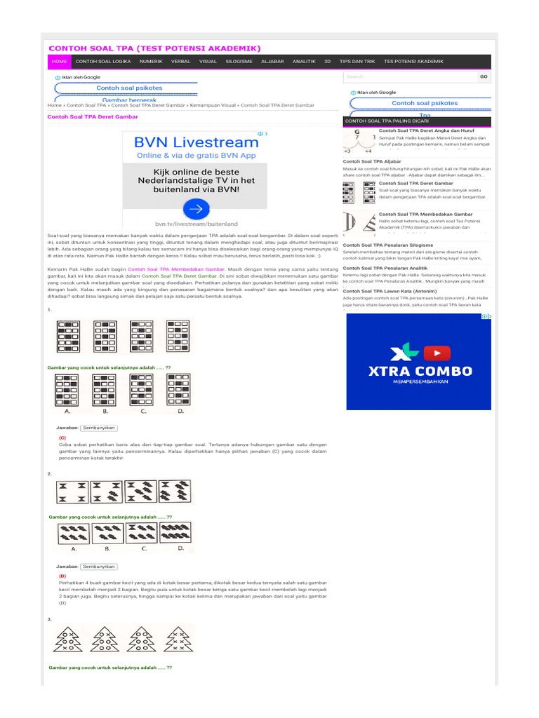 Soal-soal tes potensi akademik. soal asli tpa banyak contoh soal tpa yang dapat anda peroleh dengan mudah dan gratis. tapi, apakah ada jaminan itu benar-benar soal tpa?. jangan pertaruhkan masa depan anda dengan ketidakpastian. tpa bappenas, snmptn, & cpns pembelajaran tpa didesain khusus baik untuk soal-soal tpa versi bappenas, snmptn bahkan ons. Contoh soal test potensi akademik tpa terbaru lengkap disertai dengan jawaban dan pembahasannya, numerik, logika, verbal, visual, tips dan trik contoh soal tpa (test potensi akademik): hasil penelusuran untuk tes potensi akademik gambar pdf. Tes spasial online, tes kemampuan spasial. tes spasial online atau tes kemampuan spasial, latihan soal psikotes kemampuan visualisasi spasial (kemampuan visual-spasial) merupakan satu kemampuan dalam memanipulasi gambaran dua-dimensional dan tiga dimensional secara mental yang dilakukan lewat gambar yang berbeda dan menentukan pola pada gambar tersebut.